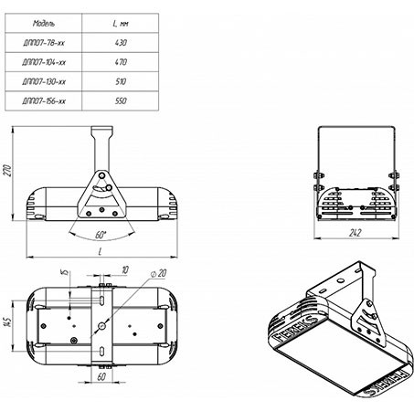 | Габаритные размеры светильника, мм | 510х250х270 |