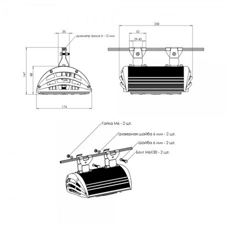Удобное и простое крепление позволяет быстро монтировать светильник на трос диаметром 4-12 мм.